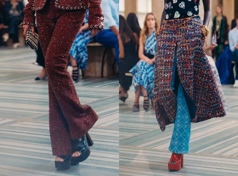 模特兒穿梭在宏偉的達卡前司法宮內,一套套合身長版外套、緊身喇叭長褲,有著溫暖繽紛的色調,閃亮墜飾與刺繡亮片,或是妝點上細緻的蕾絲細節,向七○年代精神致敬的復古尖領、厚底鞋,繡滿花朵的彩色寬版長袖上衣,多色斜紋軟呢作品和前短後長剪裁洋裝,一再體現香奈兒的精緻優雅魅力。