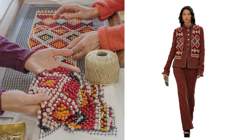 這款斜紋軟呢外套上的精美幾何圖形刺繡,結合2,000顆木製圓珠、1,200顆酒紅色圓珠、1,000顆虹彩圓珠和200顆花形水滴玻璃打造而成,如此繁複的珠繡工藝來自 Lesage 刺繡工坊透過針繡與 Luneville 鉤針刺繡工藝製作,費時87小時。
