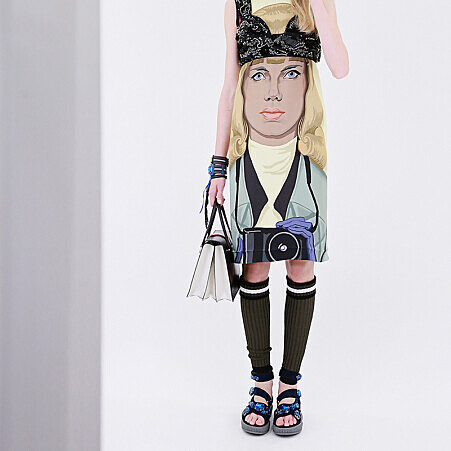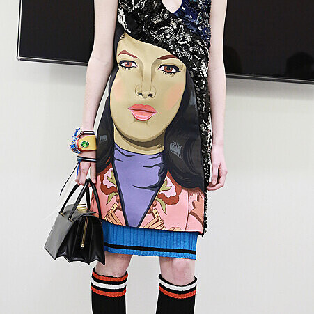 布料材質以細氈羊毛與細針織為主,強調輕盈感!而螺紋針織滾邊與拼貼設計,帶出本季街頭與運度設計元素。部落風色塊塗鴉皮草大衣,充滿活力卻不失優雅是本季秀場注目焦點。而佈滿服裝與配件上的彩色寶石與亮片裝飾,表達出設計師對華麗精緻細節的堅持! 部落圖紋與人像塗鴉是本季印花焦點,呼應秀場空間從大衣外套、洋裝到長裙貫穿整場女裝秀!