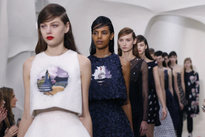 Dior 2014春夏高級時裝訂製服將情感上的緊密關聯物化到服裝上,而秀場布置得像是女性私人沙龍,不禁令人聯想起白角現代主義 (white angular Modernism) 的法國中世紀室內建築。迪奧在本季運用各種裝飾及全新構築的括型和複雜精緻的剪裁,並且將它們發揮到極致。
