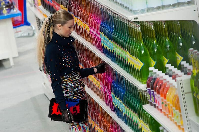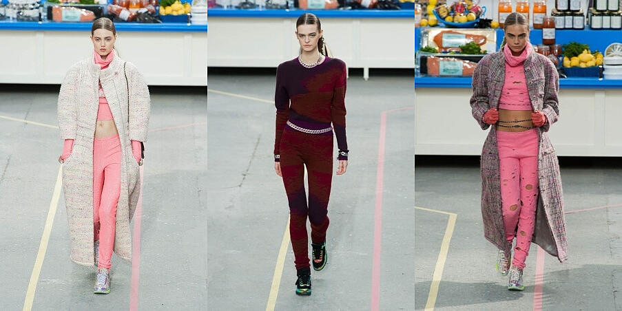 模特兒身穿粉紅雷射打洞短版上衣及合身粉紅貼腿褲,搭配圓肩長版斜紋軟呢外套,輕鬆愜意地走出,揭開2014香奈兒秋冬高級時裝的序幕,模特兒走秀同時仿若是在商場逛街的客人,偶爾會停下選購商品,卡爾.拉格斐以趣味的方式表達秋冬的概念。