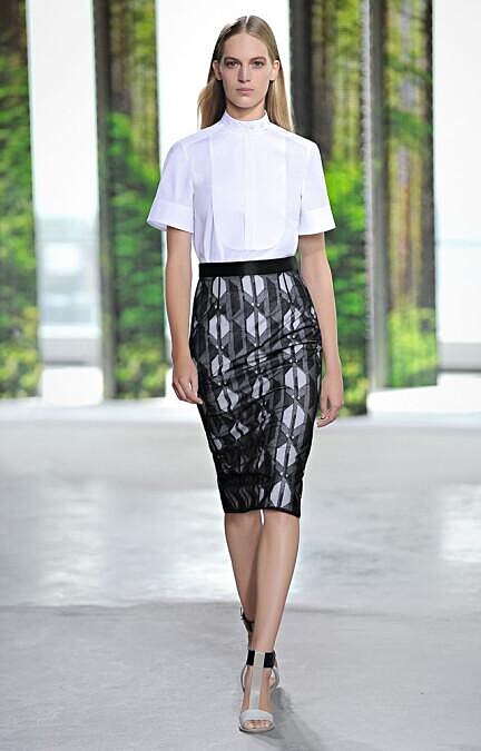 本身有型的面料為服裝提供結構框架。粗花呢、彈性針織布料和皮革材料打造出簡潔的廓形,與柔軟的尼龍紗和雪紗帶及超薄的棉府綢形成鮮明對比。受波紋玻璃紋理的啟發,將細皺布作為一種裝飾面料,應用在整個系列的服裝中。充分展示了Jason Wu對於BOSS女裝的源本理念,即人與自然的融合、有機世界和建築學融合。