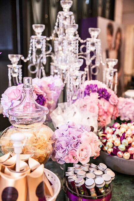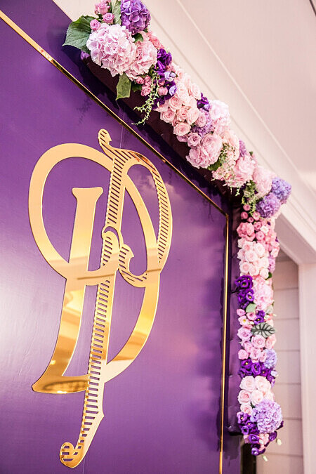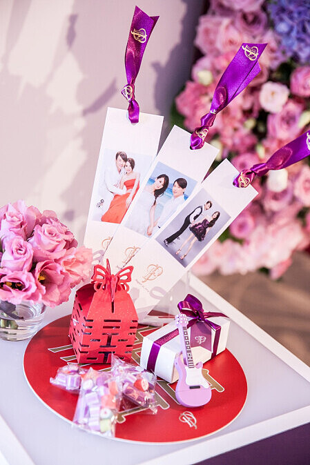 整場婚禮佈置走浪漫時尚風格,以新娘Penny最愛的粉紫色系,設計了新人專屬的「DP」Logo,巧妙運用在所有的視覺呈現以及婚禮小物上,讓現場親友除了參加婚禮之外,彷彿同時體驗了一場精品時尚與動人的音樂美宴。