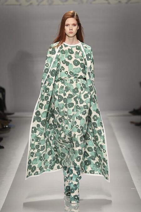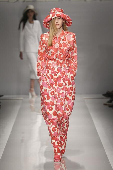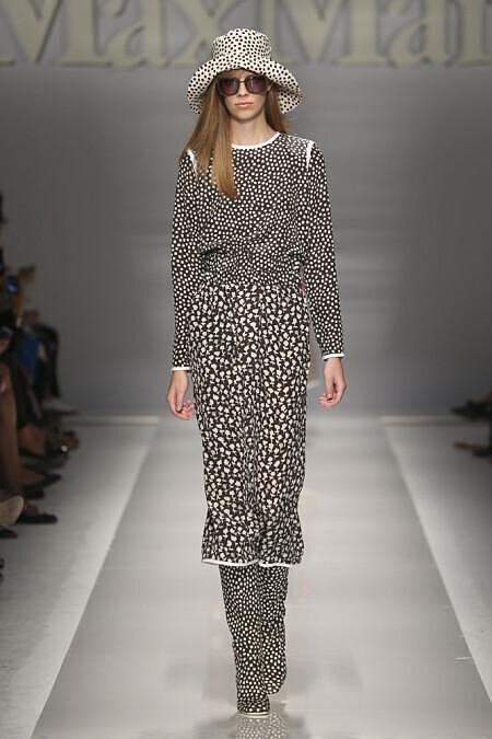 MaxMara 2015春夏系列大量運用細微花朵及幾何圖騰印花,在70年代線條的罩衫、鐘型圓帽、過膝鉛筆裙、連身洋裝,甚至是過膝長筒靴上,皆可發現其圖騰所呈現的天真爛漫身影。