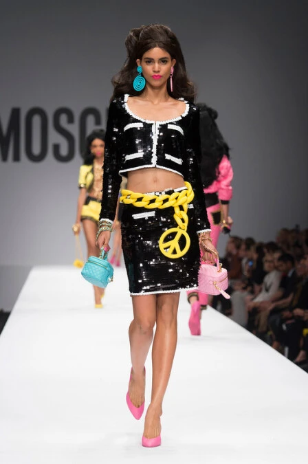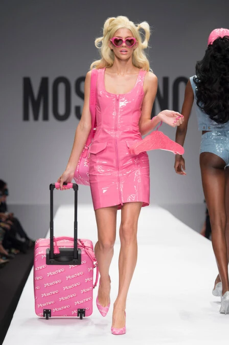 隨著音樂響起,第一位出場的模特兒頭戴金色復古假髮、嘴唇塗上泡泡糖粉色唇膏、穿上桃紅色緊身夾克和超短迷你裙,一看就知道MOSCHINO創意總監Jeremy Scott繼2014年秋冬翻完麥當勞LOGO之後,2015年春夏主題則讓每個女孩變身真人芭比娃娃!