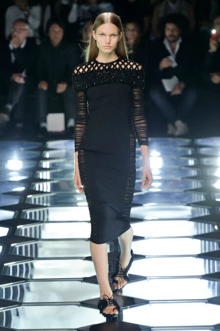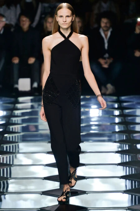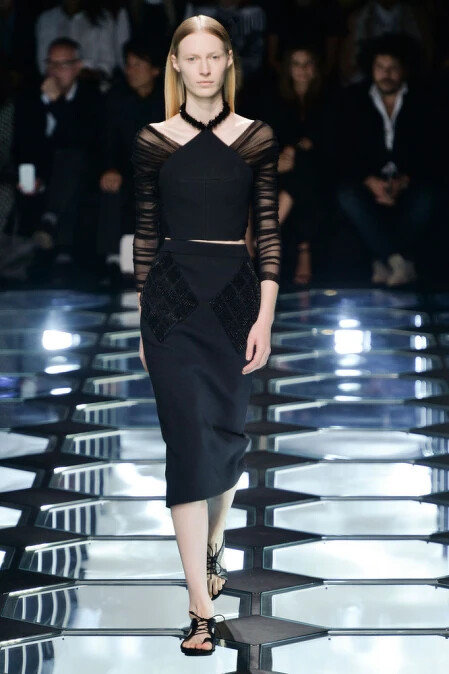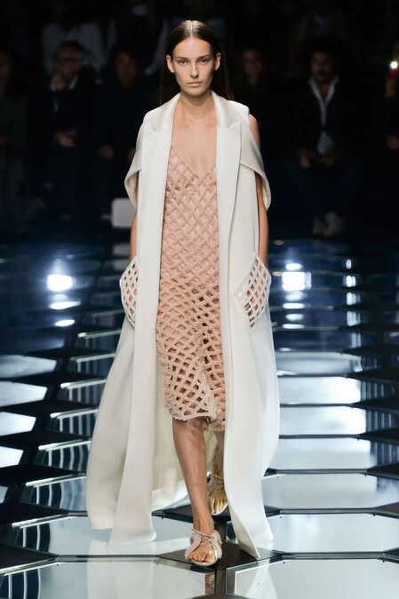 本季似乎有點回歸到大仁哥最初的運動風設計,極簡的黑色透視T-shirt配上近來大熱的超長版外套,而最搶眼的是腳上的平底涼鞋,這次靈感來自於競速腳踏車的踏板鞋,在大仁哥的巧手設計下,成為了本季最實穿的單品之一。用簡單的運動輪廓,創造出非凡的氣勢與風格。