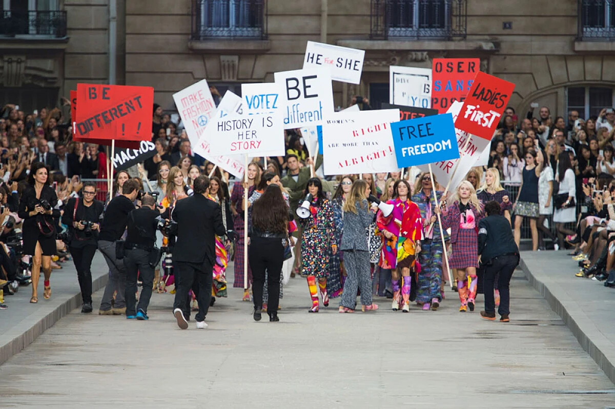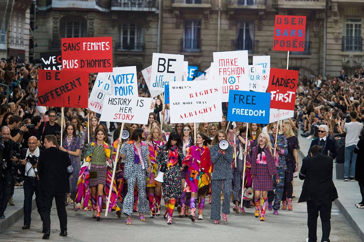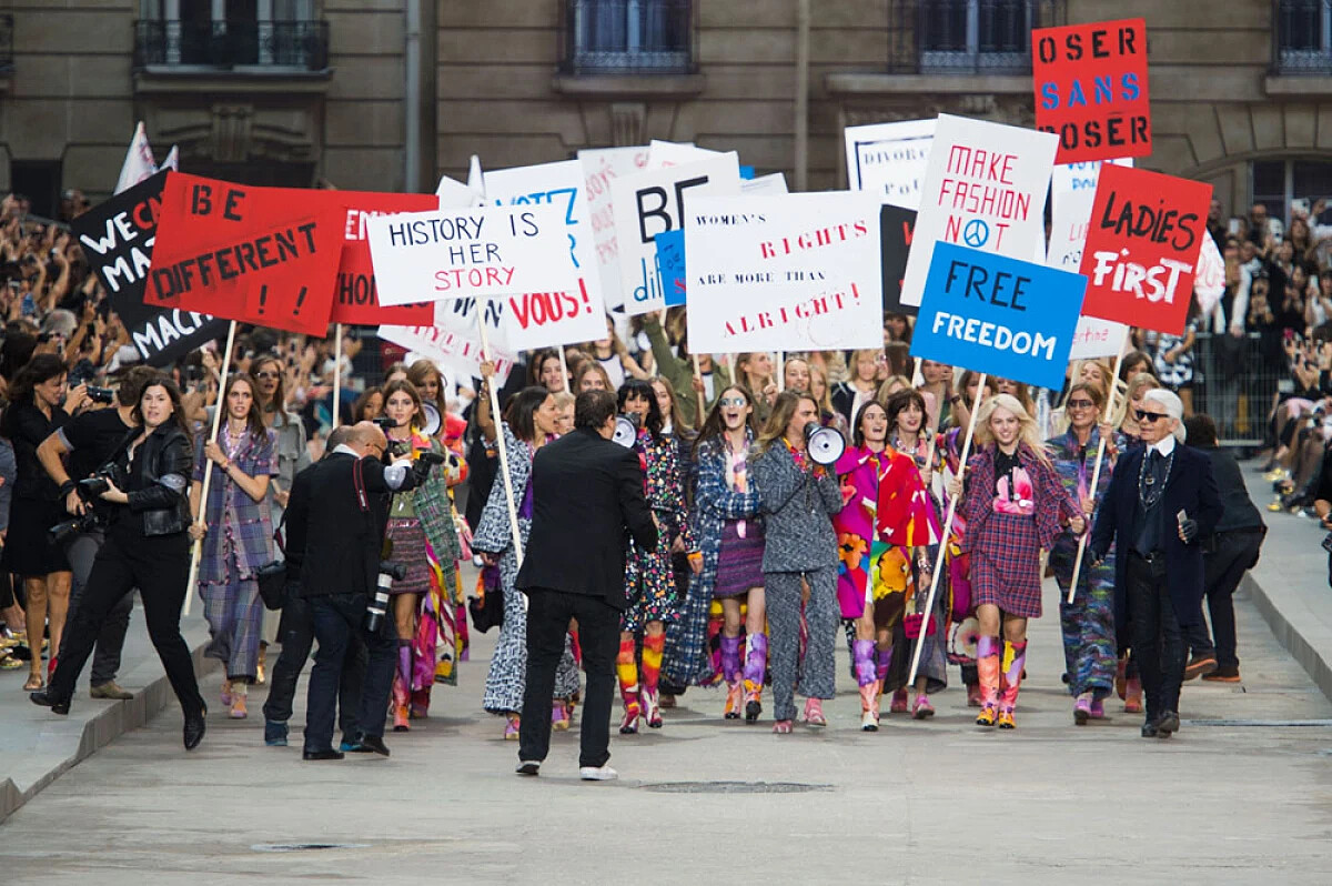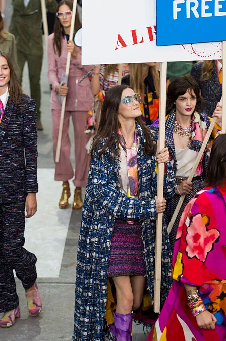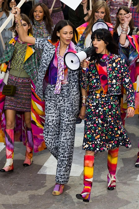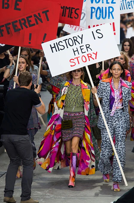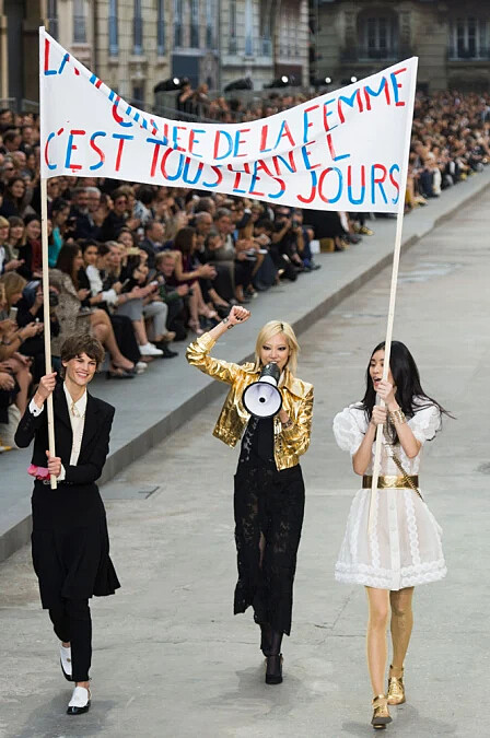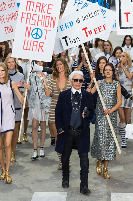 時裝週的高潮,每年都讓人期待的香奈兒 Chanel 本次將巴黎街頭移往大皇宮,舉辦了女性主義色彩濃厚的 2015 春夏大秀。除了呼應了前幾週艾瑪華森 (Emma Watson) 在聯合國動人的演講外,也反映了當時全球(包含香港)正在進行的社會運動氛圍。對於政治議題和人權都相當關注的卡爾老佛爺 (Karl Lagerfeld),這次的確透過伸展台讓所有人都注意到了這些重要議題。