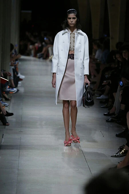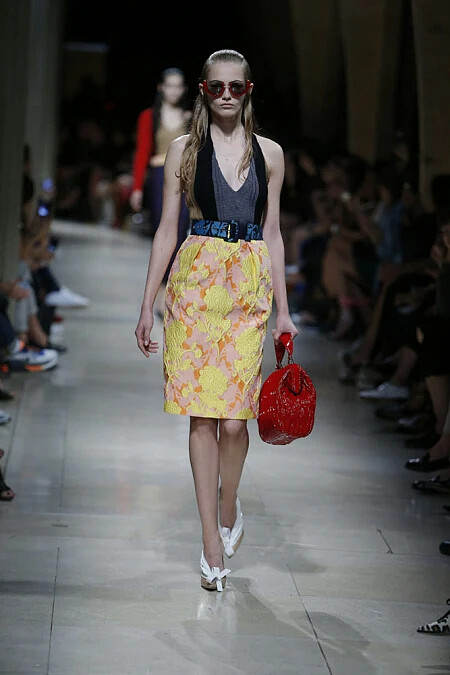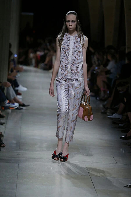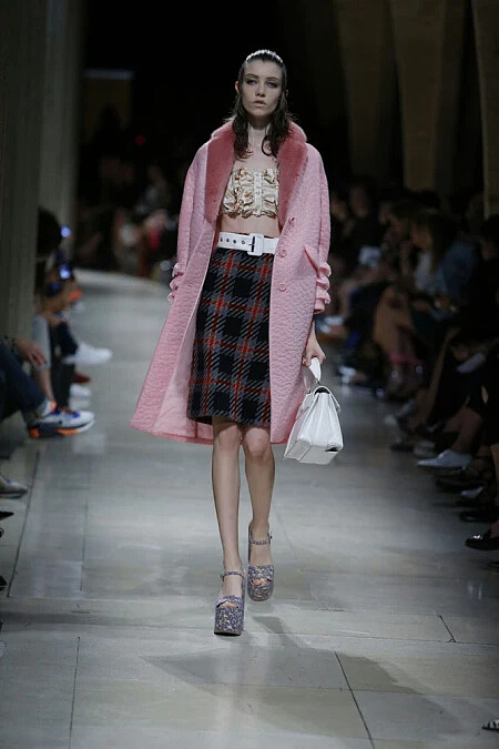 伴隨著電影的配樂以及時而沉重、時而舒緩、時而搖滾的節奏,模特兒在猶如教堂一般,重疊著繁多木造拱型樑柱的秀場空間,曲折蜿蜒的遊走。設計師 Miuccia Prada 引領大家觀賞一個看似甜美的女孩,經歷轉變、崩壞而展現出內心深處的黑暗叛逆之情。