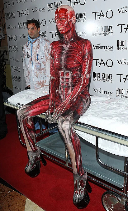 【震撼彈】2011年她推出了兩套極端造型。一套是如同在醫學博物館看到的「無皮人體」,肌肉紋理清晰可見,被稱為史上最噁心也最厲害的萬聖節裝扮之一!