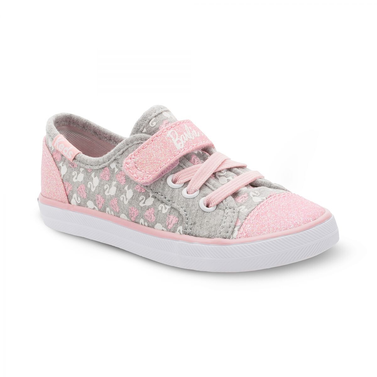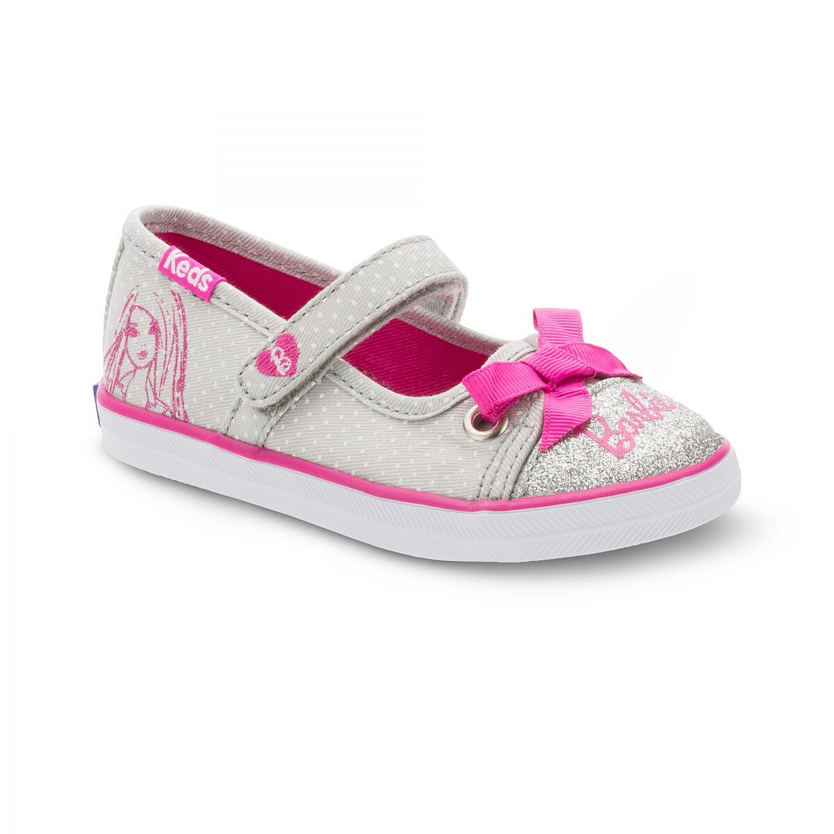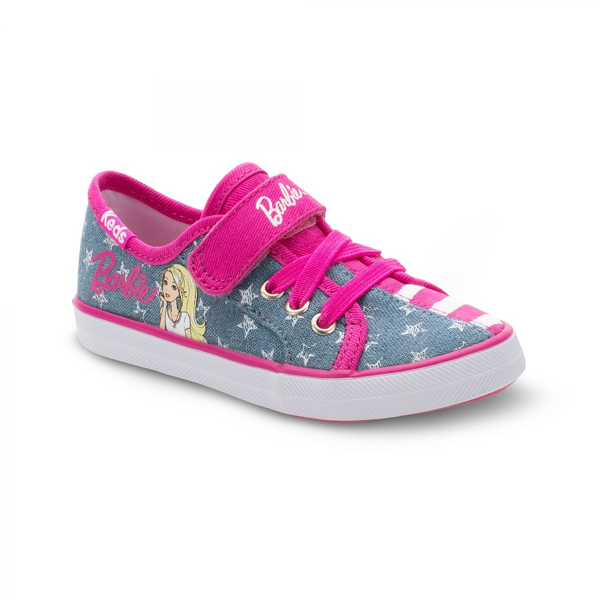 亦或是,美國風牛仔布MIX條紋印花布,不對稱感俏皮又可愛;滿版 Barbie 肖像印花,點綴亮粉於鞋頭、鞋後跟及粘扣帶上,你說嘛!!小女孩怎能抵抗閃亮亮元素?
