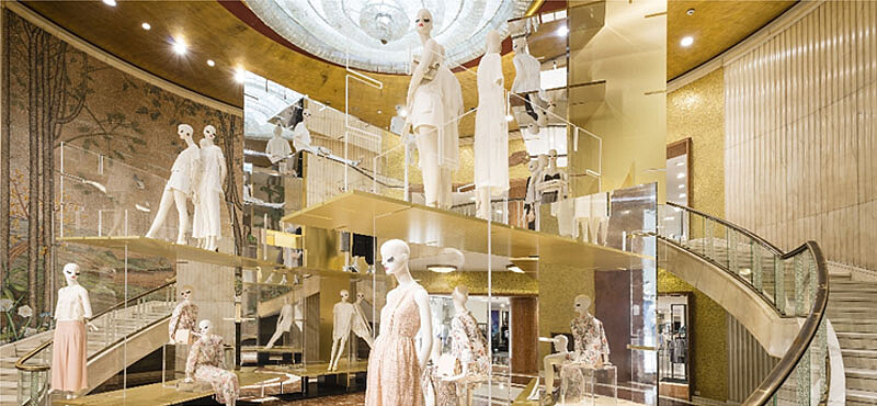 ZARA位在米蘭精品大道(Corso Vittorio Emanuele)的旗鑑店,今年再度與知名建築事務所CSL,在米蘭家具展的會外展攜手合作,設計師Charles 與 Ray Eames以36張金色、銀色與透明玻璃面,交織搭建出兩區展示舞台 ,將6尺高的「紙牌屋」搬上時尚櫥窗。