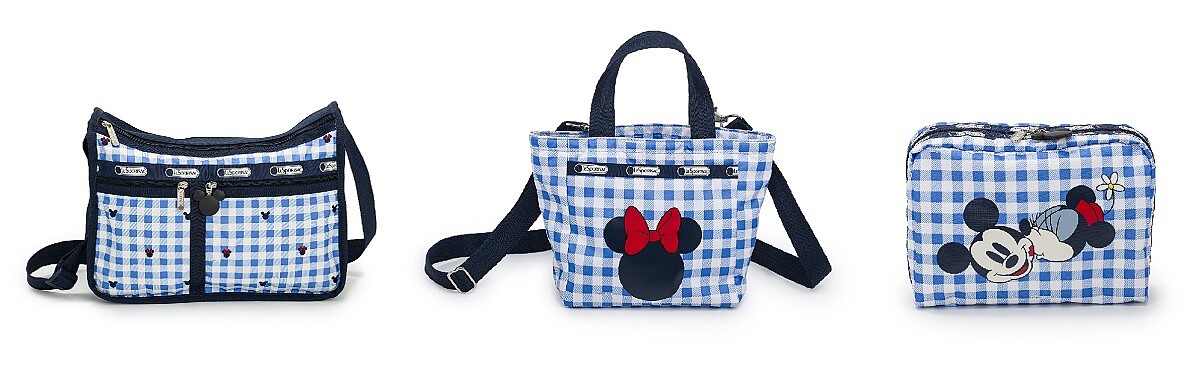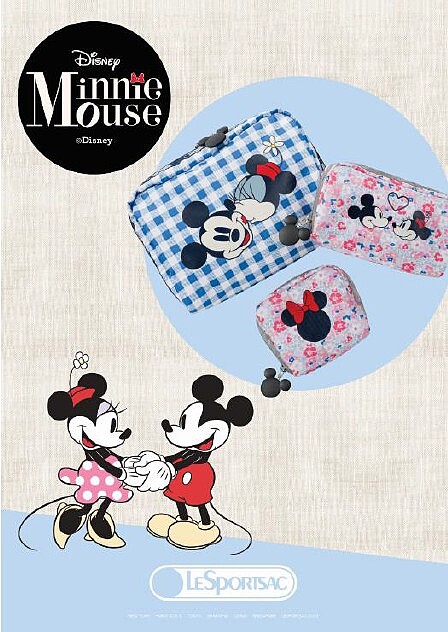 由藍白色格紋所組成,印著最為世人所熟知的米奇&米妮剪影,並佐以鮮紅色米妮蝴蝶結點綴,另外還有Love Check化妝包,以熱戀中的米奇米妮接吻形象現身、Springtime Outing托特包則是印有超大的米奇米妮剪影,其中最別致的是托特包及化妝包的兩面,運用不一樣的印花呈現設計感,揹哪一面都可愛。