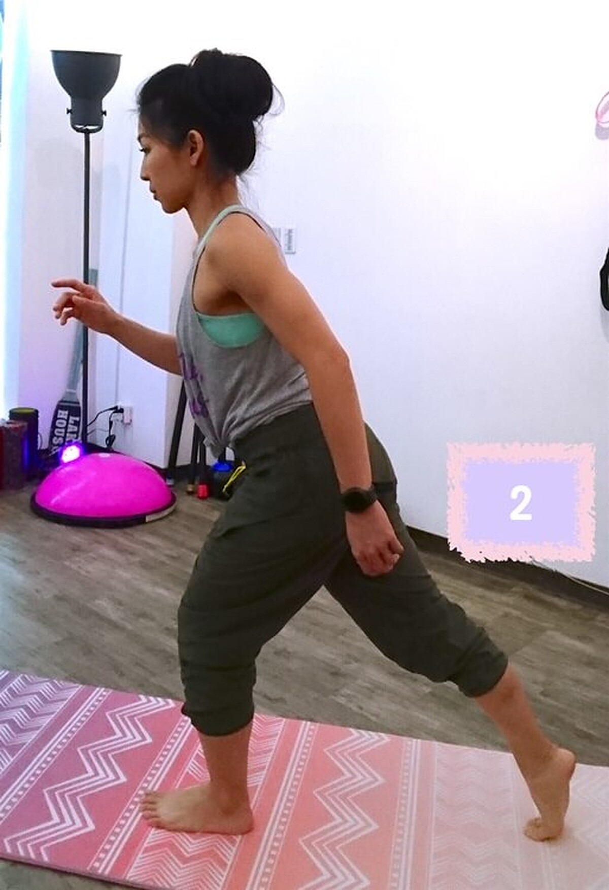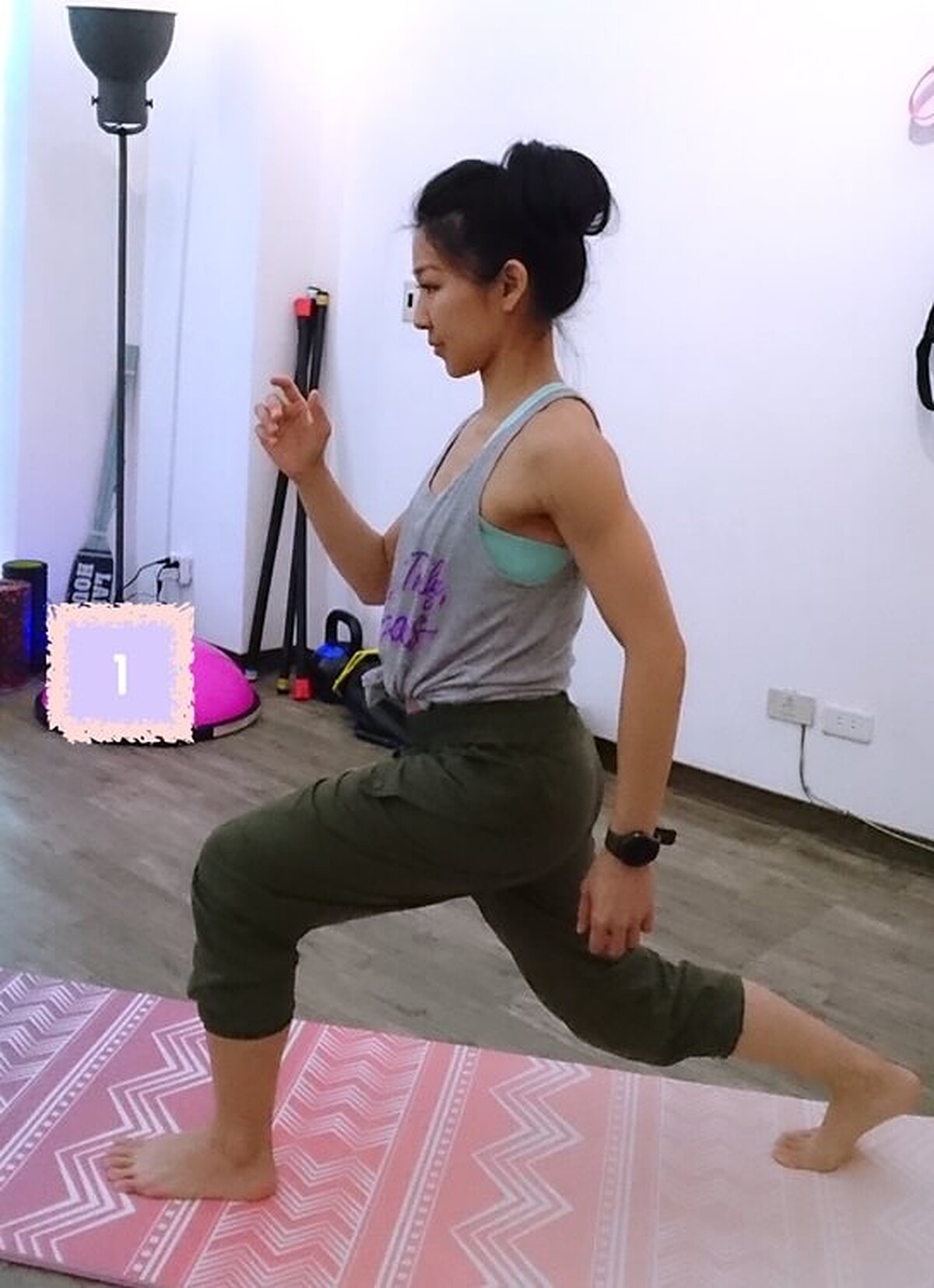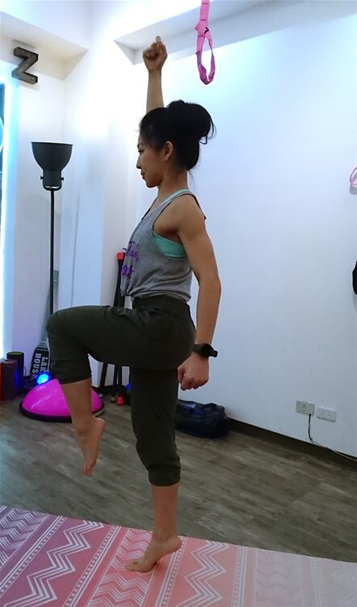 接著臀部出力將後腳抬起至大腿與地面平行,保持平衡穩定。
