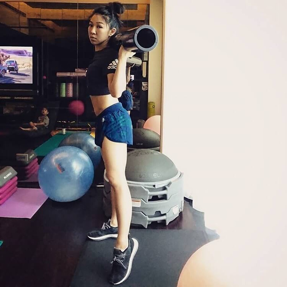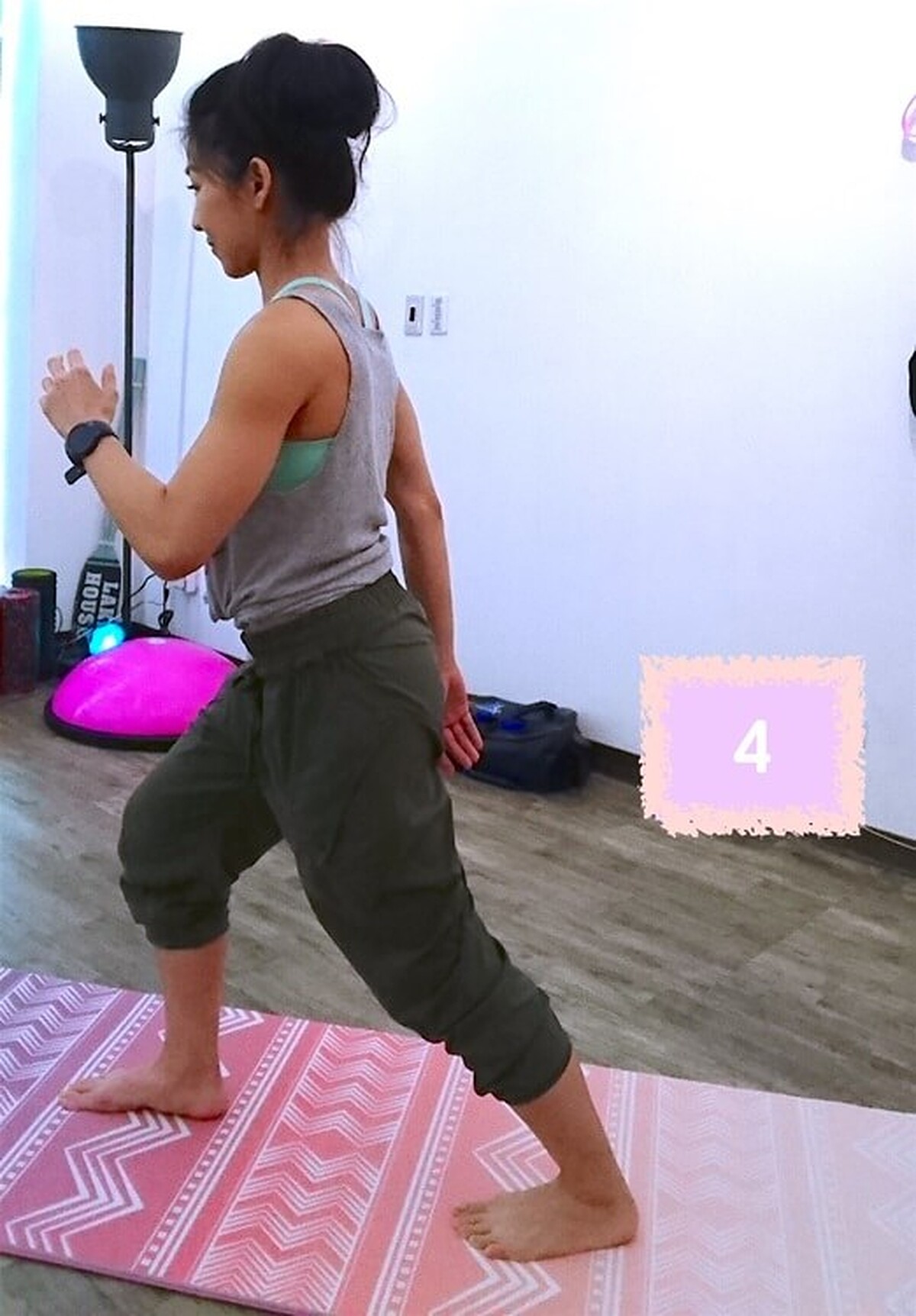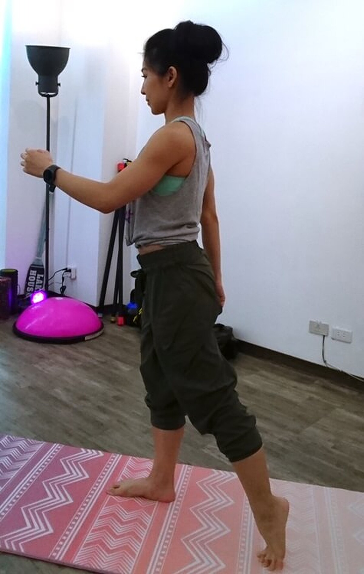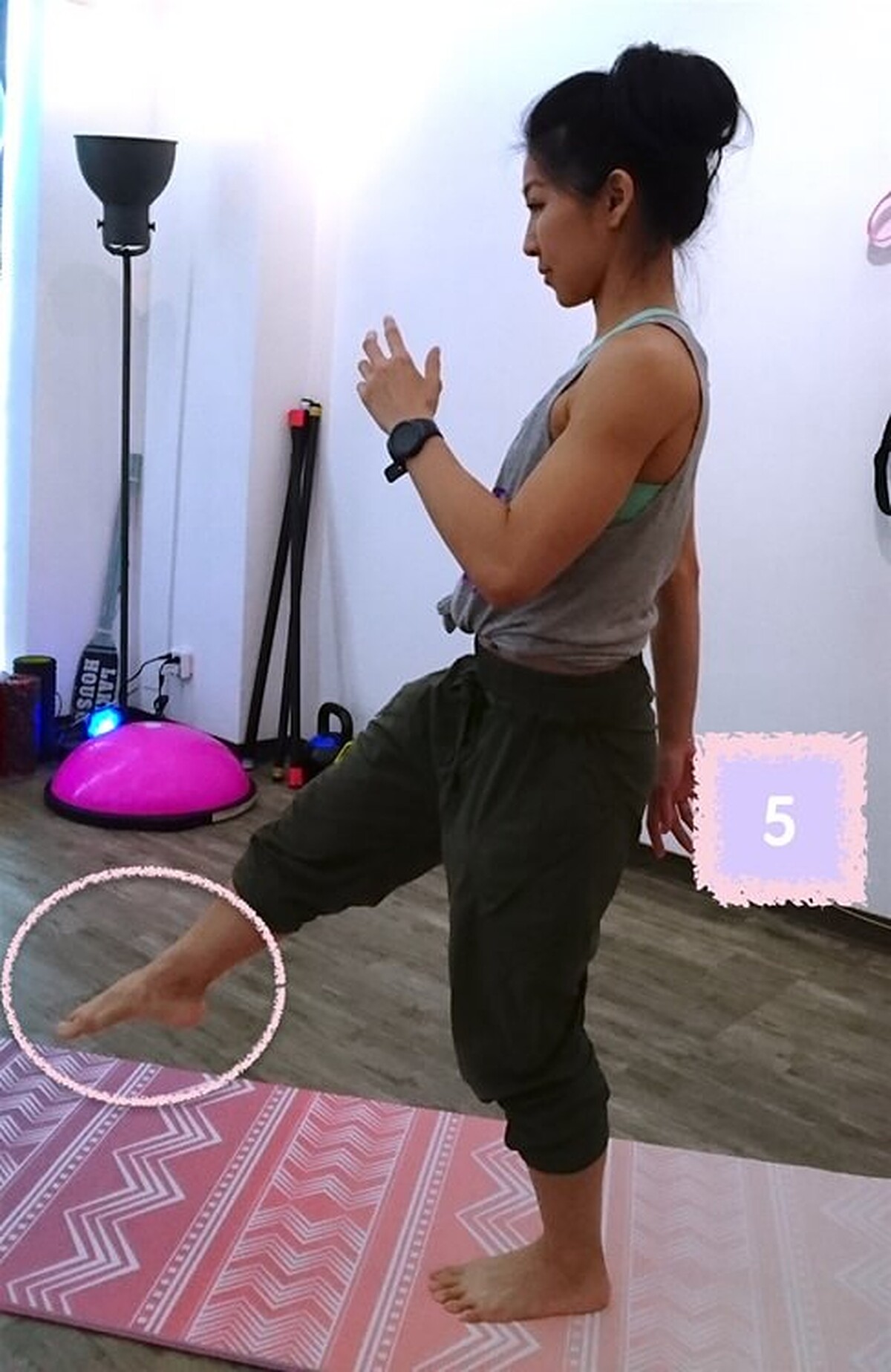接著臀部出力將後腳抬起至大腿與地面平行,保持平衡穩定。