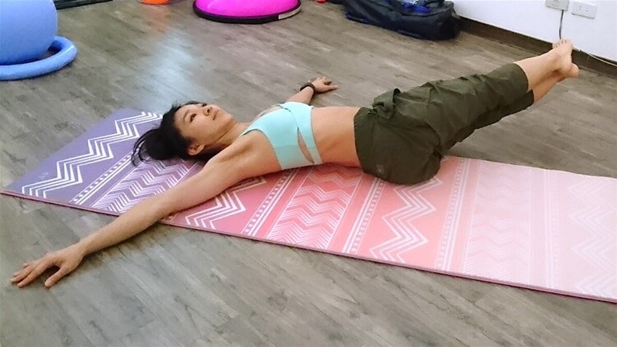 記得後腰保持貼地,腿保持伸直,雙腿抬起至與地面垂直,這是動作啟示位置。接著分別往斜前方方向放下去至離地面15-45度,再拉起回到起始位置。