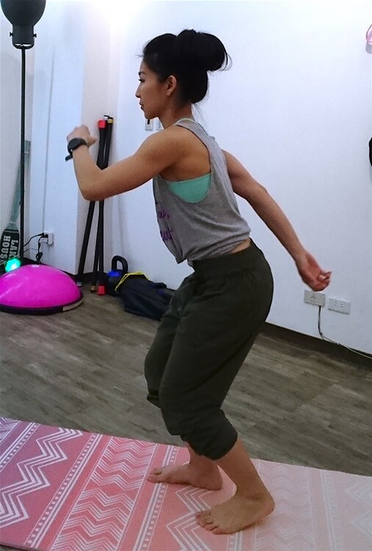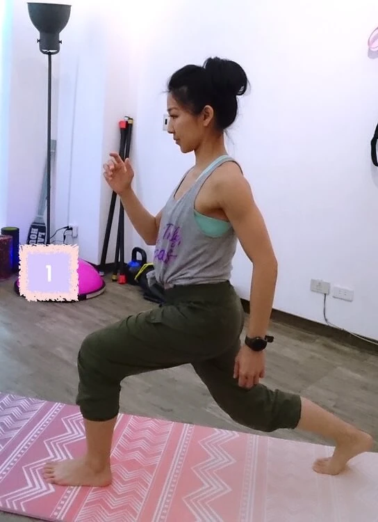 起始動作微分腿蹲,後腳跟要拉起來,前腳屈膝90度,重心放在臀部,上半身保持直立,核心收緊。