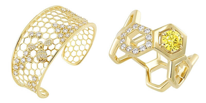 以白色晶鑽鋪鑲成的線條勾勒成蜂巢立體的外形,並以粉黃色晶鑽點綴,好比蜜蜂環繞蜂巢飛舞,折射閃爍金光。
