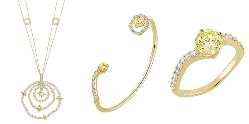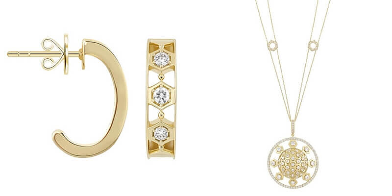 設計師將巧妙結構的蜂巢造型注入首飾,以鍍金六角形鋪鑲成富層次感的Honeycomb項鍊。白色晶鑽圍繞六角形,與中心的明黃色晶鑽互相輝映,描繪蜜蜂來回蜂巢,充滿活力的景緻。