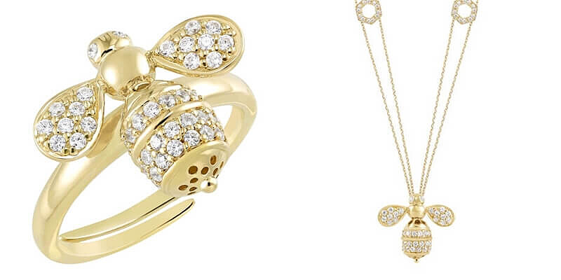 蜜蜂造型首飾系列,以蜜蜂立體體態打造而成,配上白色晶鑽鑲嵌於鍍金底座,別緻可愛。