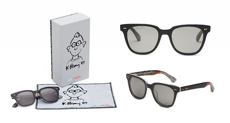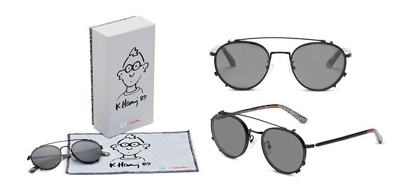 以復古飛官款設計而成的光學眼鏡,另附有可加掛並以青銅色金屬框固定的綠灰色偏光鏡片,能消除眩光對眼睛的影響。黑色醋酸纖維鏡臂內面添加Keith Haring的細緻塗鴉圖案,配戴合身舒適外兼具時尚品味。