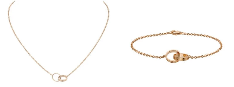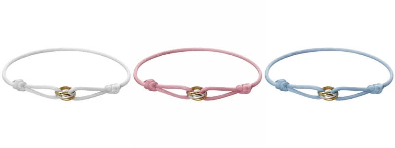 三環相扣的戒指,以三種材質表達三重意境,白金代表友情,黃金象徵親情,玫瑰金則是詮釋愛情,連同絲繩一起出售,共有25種色彩提供選擇,可至台灣任一卡地亞專賣店免費替換。