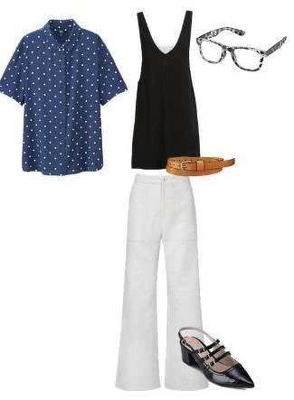 挑選一件 Hana Tajima For Uniqlo 聯名款高腰寬板長褲,而且一定要清爽白,搭上簡單黑背與波卡圓點短版襯衫,利落敢打勾!清新不膩打勾!!
