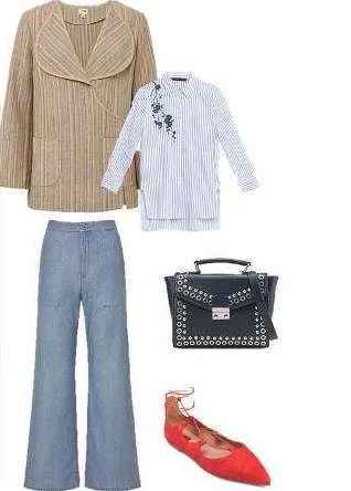 殷殷期盼的小週末星期三到囉!!!輕鬆一點的穿著,相當適合小週末星期三,Hana Tajima For Uniqlo 聯名款丹寧高腰喇叭寬褲與棉麻面料交襟外套,清爽效果滿點,內搭今年春夏帶點復古文藝復興圖騰條紋襯衫與帶有個性意味的鉚釘提包以及繫踝平底鞋,帶出中性的細膩風格。