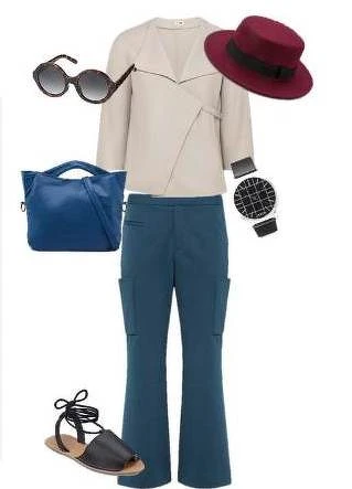 來點低調沈穩色調穿著,讓煩躁心情好些!像是 Hana Tajima For Uniqlo 聯名款灰藍小喇叭褲與米色交襟外套的組合,搭著濃郁藍色系包包與黑色調鞋子與手錶。