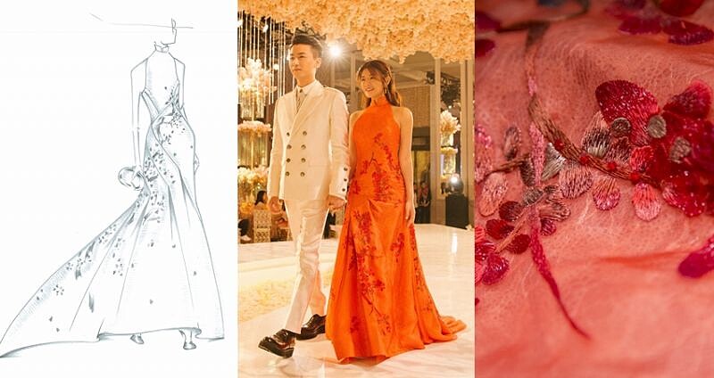 比起第一套Alexis Mabille的大膽馬甲,夏姿·陳SHIATZY CHEN打造的古典旗袍禮服顯得更適合她許多,製作細節也隨之曝光,原來胭脂紅布料上的紫藤花刺繡,融入了設計師對這對新人的祝福,花語是「醉人的戀情」,層層堆疊的烏干紗、中式小立領、和背部以施華洛世奇水晶編織而成的珠鍊,做工相當精緻,前後約花費三個月時程完工;陳曉的白西裝同樣由SHIATZY CHEN打造,銀灰色法式領結帶出貴族氣息。