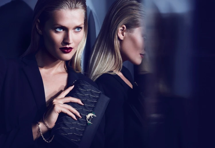 在配件部份則結合具體與抽象的概念,以卡地亞動物主題系列的象徵性動物: 鱷魚為主題。這款卡地亞鱷魚絲綢手提包,展現手工打褶技術,以珍貴的圖案展現鱷魚的意象,並搭配金粉裝飾,讓提包變得更亮眼。攀爬在手袋上的鱷魚胸針可拆下作為胸針佩戴。