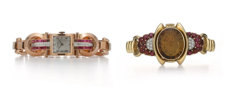 Tiffany在1939年紐約世博會展覽的主角是一系列驚豔優雅的鉑金鑲鑽Cocktail腕錶,以及吸睛搶眼的「雞尾酒會風格」錶款,例如幾何造型的Trapezoid腕錶,金光閃爍,以紅寶石突顯風格。