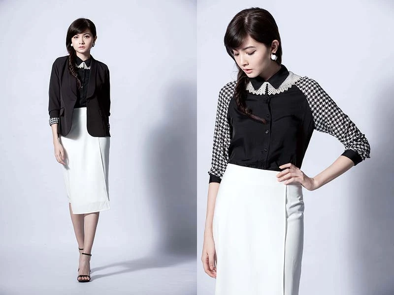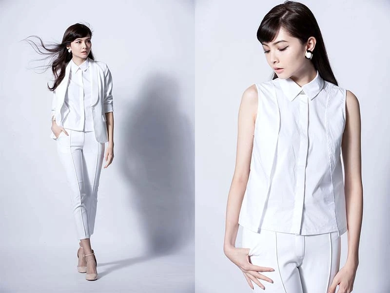 不擅長配色的人,單一色系是個不錯的選擇。我們可用白色絲瓜領樣式的短版外套,搭配上直線剪裁的無袖襯衫和合身窄版褲,以純白色調展現明亮清新氣質;細節上,褲子前方的立體裝飾線搭上膚色鞋款,讓視覺延伸的小秘訣,拉長了下半身的線條比例。
