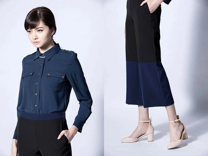 下半身可搭配較為合身的褲裝或窄裙,以上短下長的方式,重新配置對你有最有利的視覺比例;而窄裙的款式,具有變化的開衩細節或巧思,除了更易於行走,活力動感的剪裁能讓妳跳脫老氣印象。