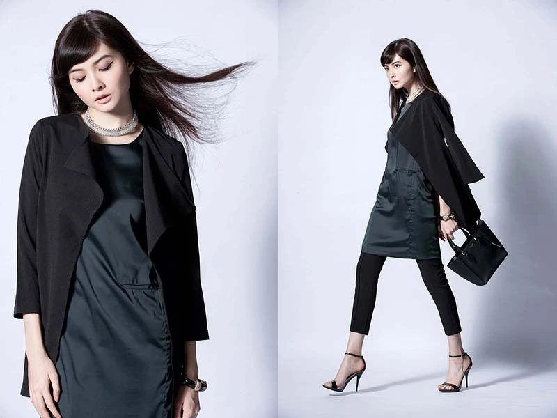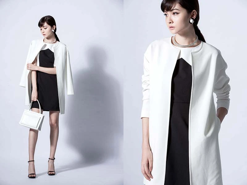 一件式洋裝是上班族女性衣櫃中必備的單品之一,不用思考太多的剪裁輪廓,透過不同款式的外套與飾品配件組合,就能輕易穿出截然不同的風格。我們可用同樣無領的長版西裝外套來搭配這件黑白拼接洋裝,背後開衩細節與A-Line線條,在微妙的層次交錯中突顯優雅魅力。