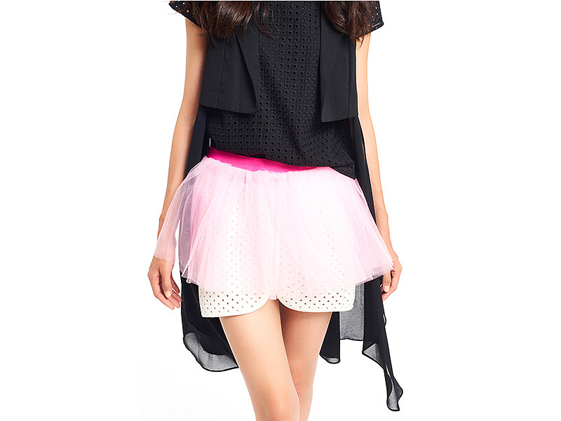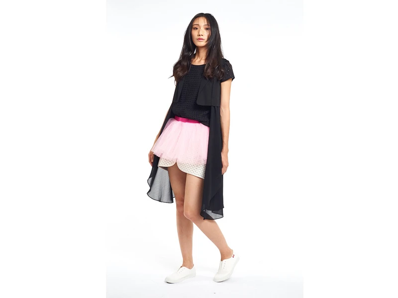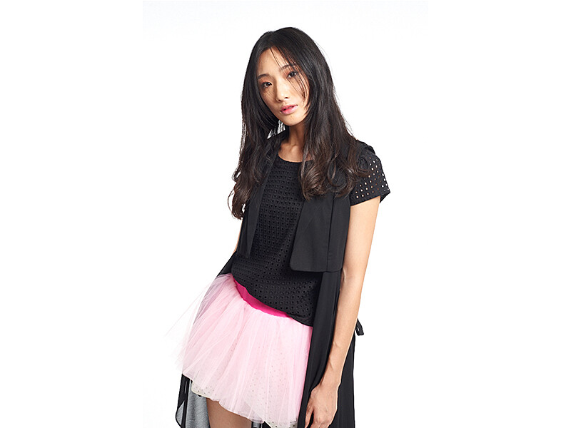 而外罩的短粉紅澎裙,則是將俏麗活潑的氣息與強硬個性的黑白態度,彼此做了融和,於個性摩登酷味之下,稍做軟化,增添些許女孩輕盈的姿態。