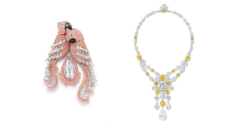 一系列首度亮相台灣的全新珠寶傑作,也印證格拉夫的慧眼與巧思。鑲嵌30.94克拉水滴形切割淺粉紅鑽的鑽石鸚鵡胸針,栩栩如生,而鑲嵌一顆30.88克拉D色無瑕圓形白鑽和一顆19.23克拉D色內無瑕梨形白鑽吊墜的黃鑽和白鑽項鍊,鑽石共重186.05克拉,延續格拉夫「鑽石之王」的傳奇。
