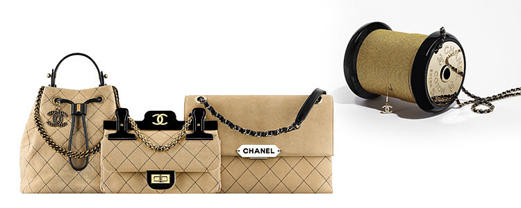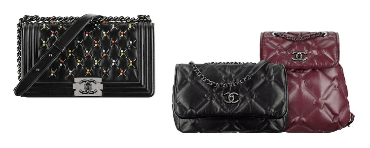 一款BOYCHANEL包看似佈滿了裁縫師的小別針。由Montex工坊特別創作此特殊刺繡款,結合銀色金屬條狀細管與彩色珍珠圓珠縫製成。另有款式則搭配珍貴的斜紋軟呢辮飾。此秋冬系列的重點細節之一是綁帶,靈感取自於搭配馬甲洋裝與馬靴的皮革綁帶,在皮包上結合皮革與斜紋軟呢編織繫帶而成。
