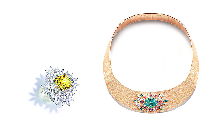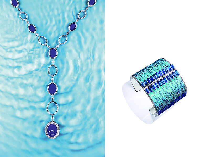 度假泳池所閃耀出的波光粼粼成為Pool Side的創作來源;與羽毛工藝大師Nelly Saunier合作所構思的珠寶手鐲,利用鳥羽嵌花技術將鑽石與藍寶石交織出深淺層次的湛藍色系,打造出令人驚豔的精彩作品。此外以不規則形青金石點綴在宮廷裝飾的白金鑽石手鐲、澳洲黑色蛋白石搭配藍寶石與祖母綠的獨特項鍊錶,到泳池水面上的漣漪與氣泡所衍生靈感的藍寶石鑽石項鍊,以非凡閃耀的姿態勾勒出泳池畔眾人玩樂的愉悅愜意時光。