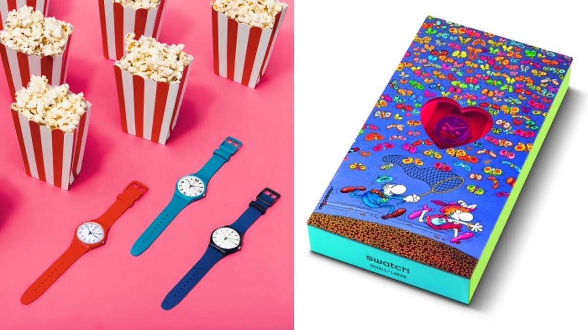 還有極簡元素打造的「就是Swatch」系列,搭載大量時尚色塊與俐落線條,看似簡單卻展現活潑俏皮和無比的活力。為迎接情人節到來,限定特殊包裝「奇幻之戀」以奇幻卡通的畫風,繪出綿羊眷侶和滿天彩色蝴蝶,就彷彿捎來甜蜜的愛戀十分可愛!