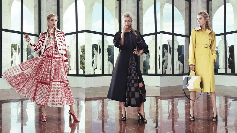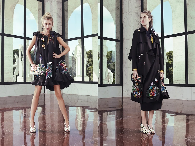 以紅白色美國拼布工藝為靈感的Fendi早春度假系列,為新一季帶來耳目一新的視覺刺激,Karl Lagerfeld運用幾何圖形、色彩、東方花卉圖樣以及充滿律動感的波紋,描繪出女人柔媚浪漫姿態。日式蒔花壁紙衍生出的印花圖案、以細線和亮片在烏干紗和絲毛混織布料上的刺繡,以及服裝上以薄紗搭配彩色短貂毛皮草的點綴,在繁複細節中展現品牌奢華工藝;又或是加入鉚釘、丹寧嵌花等元素,在剛柔輪廓間創造和諧對比,打造新一季充滿女人味的摩登風尚。在配件部分,可愛吸睛的全新版本Bag Bugs吊飾、金色飾有皮草的字母ABClick吊墜,以及有著波紋輪廓的繽紛鞋履以及各式包款,都十分令人期待2017的到來。