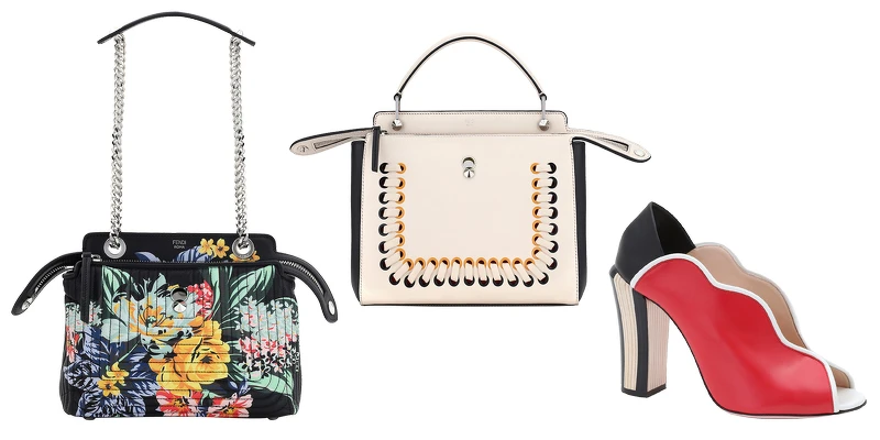 (左)花卉圖騰Dotcom Click包 (中)奶油色Dotcom Click包 (右)色塊拼接波紋跟鞋