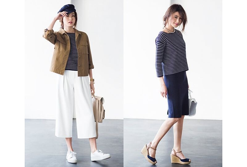 度假休閒隨興風:圓領條紋毛衣外搭一件軍裝風的工作外套,創造個性又休閒的度假氣息。