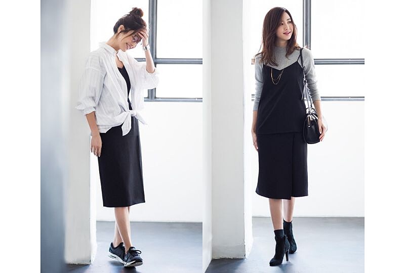 追求時髦的細肩帶穿搭:延續冬天流行的細肩帶上衣,這個春天加上一片裙的搭配,飄逸的下襬與全身黑的組合,低調之餘也讓時髦度大增!