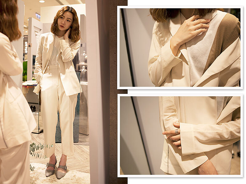 20,000,000 fragments米白西裝外套,內搭JEAN GENIE & HUNGRY FREAKS , DADDY拼接色塊針織上衣,加上與西裝成套的米白煙管褲,再配上暖色調的灰色方釦粗跟鞋,穿出時髦優雅的俐落感。