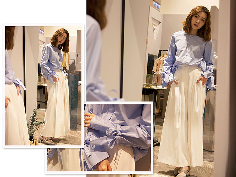 在春夏最受歡迎的水藍、白、粉等清新明亮的色系,是提升好感度的最佳選擇!如何為平凡造型中加入鮮明的個人印象,可選擇在上衣下襬或袖口處有獨特設計的款式,像是1/2 UN-DEMI運用繫繩綁帶束口的寬袖襯衫,搭配上SKETCHAROUND顯瘦的寬版裙褲,讓低調優雅的魅力在不誇張的設計巧思中一一展現。
