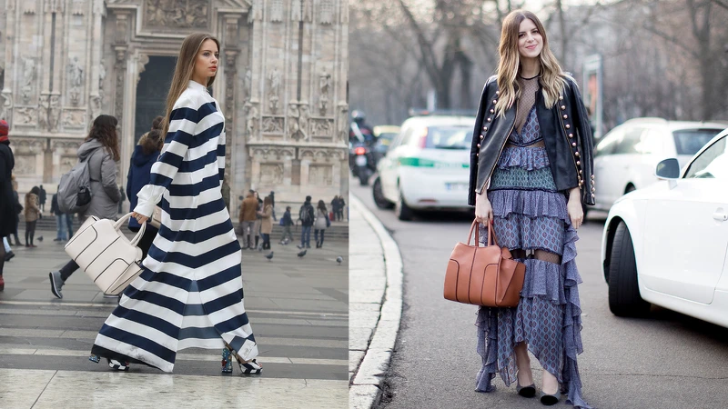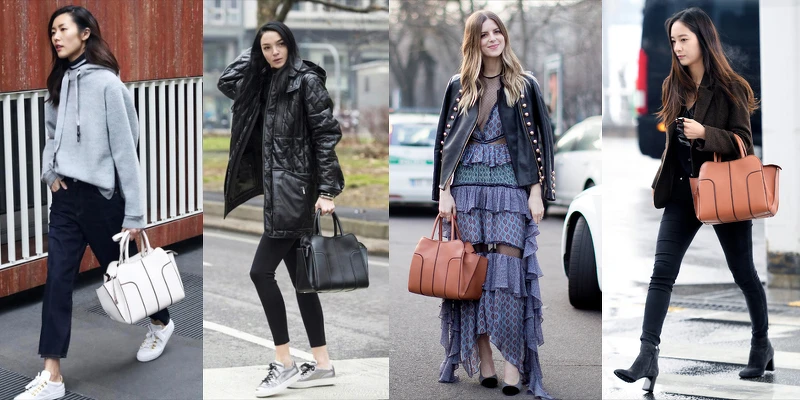 在網路社群相當活躍的模特兒也是自媒體經營者Xenia Tchoumitcheva,以搶眼的黑白條紋配搭白色TOD'S Sella Bag,展現大膽前衛風格;而總是給人優雅印象的時尚生活部落客Michelle Madsen,則以浪漫的荷葉洋裝搭配,呈現完全不同的時尚氛圍。