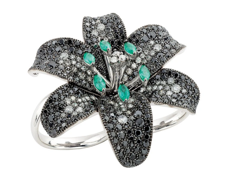 Giglio百合花系列白鑽、黑鑽與祖母綠寶石戒指 。