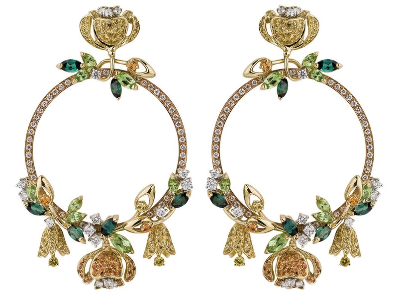 Springtime春天系列鑽石、綠寶石、橄欖石、碧璽與黃水晶耳環。