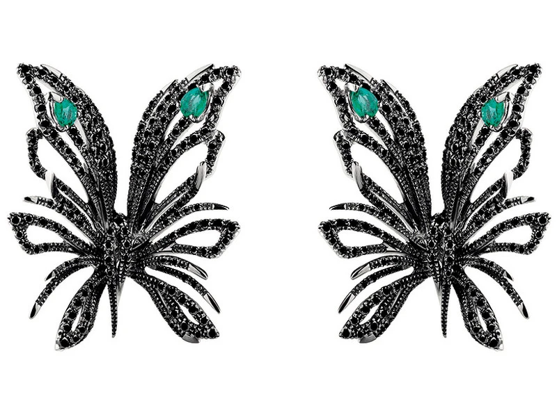 Butterfly彩蝶系列黑鑽石、白鑽石與祖母綠寶石耳環。