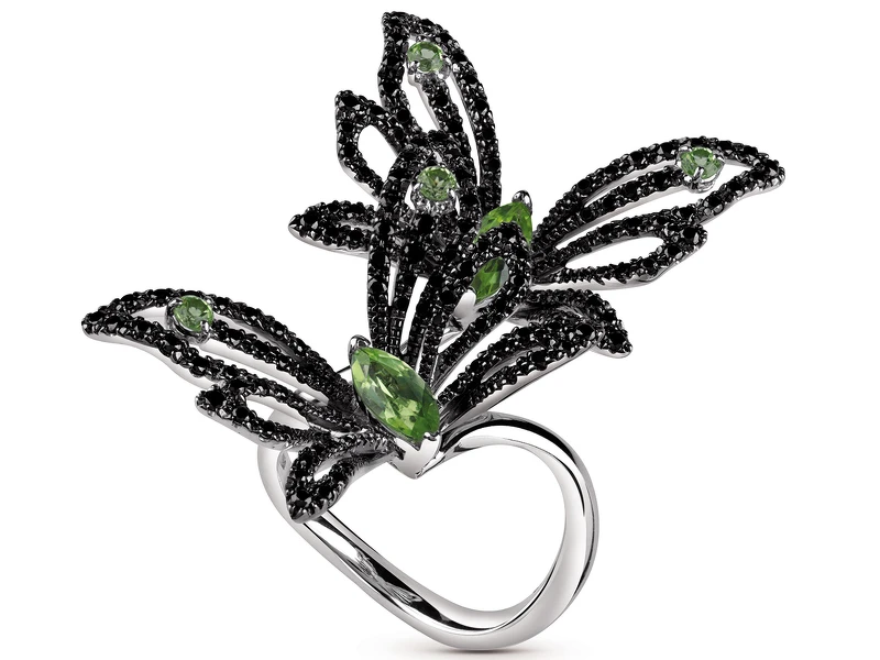 Butterfly彩蝶系列黑鑽石、白鑽石與橄欖石戒指。